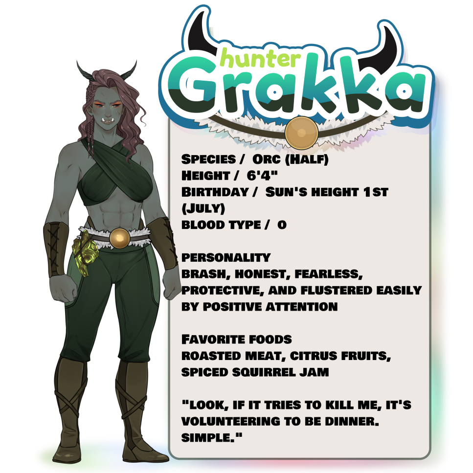 Grakka began as a D&D character, starting as a 3rd edition character and later updating to Pathfinder. She was a half-Orc Earth Genasi, the granddaughter of an Orc chieftain named Thrall (yes, my DM borrowed the character from WoW.) At the start, she was a pure Ranger under the effect of three curses, one of which made her instinctively distrust, well, everyone. The result was a withdrawn, surly, and very difficult member of the party to get on with. After an adventure through her psyche (where it was discovered she had three superpowered orc children as guardians of her mental landscape, the Grakka Gruff Girls), the curse was lifted, her newfound psionic abilities made her a Ranger/Soulknife multiclass, and that was when her personality began to shine - confident in her strength, protective of her friends, caring of those in need and insistent in helping them discover their own strengths, helping several NPCs up into positions of leadership in their own societies.VTuber Lore